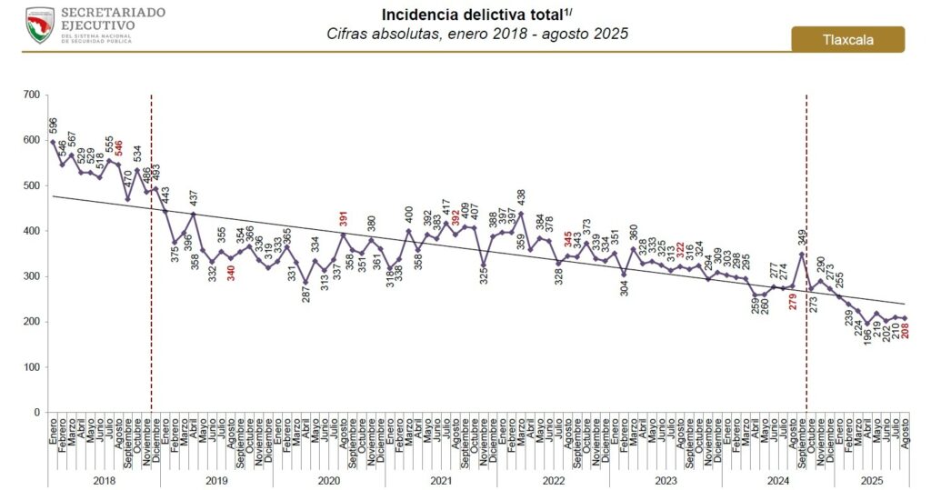 Con base en el registro histórico de cifras absolutas del CNI, durante la administración encabezada por la gobernadora Lorena Cuéllar, la incidencia delictiva en el Estado de Tlaxcala ha mostrado una marcada tendencia a la baja, comportamiento positivo que se ha acentuado a partir del presente año.