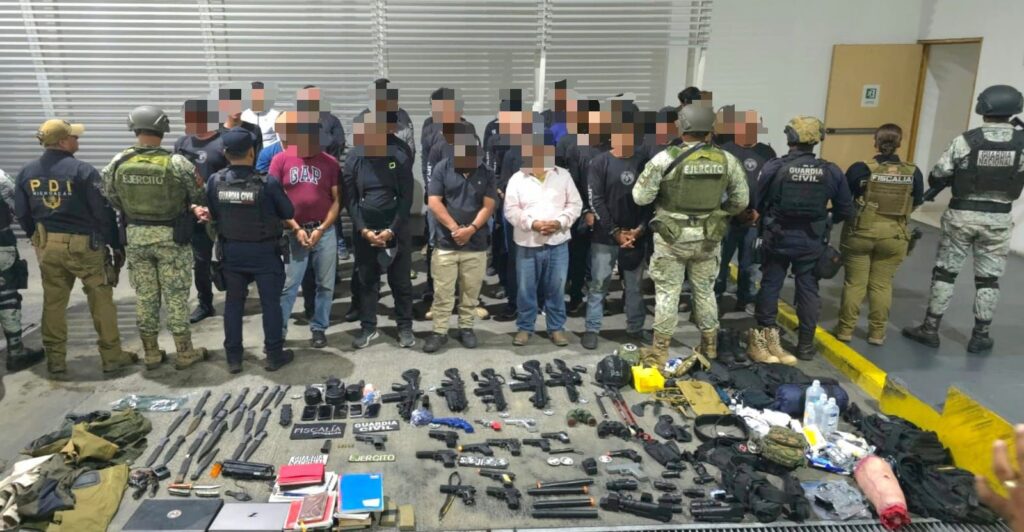 Además, se incautaron cuchillos, navajas, vestimenta y equipo táctico, cascos balísticos y equipo de radiocomunicación. Uno de los 38 detenidos es ciudadano de Estados Unidos, mientras que el resto son originarios de varios estados de México.