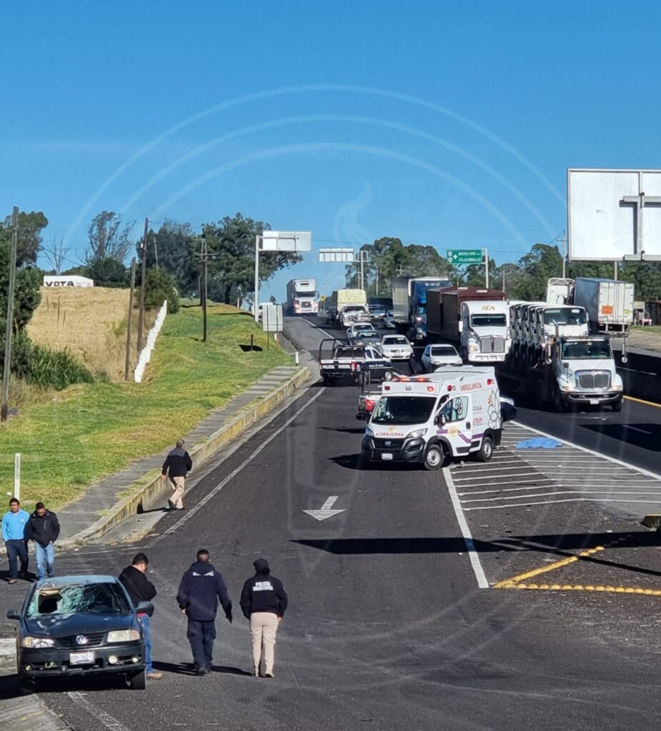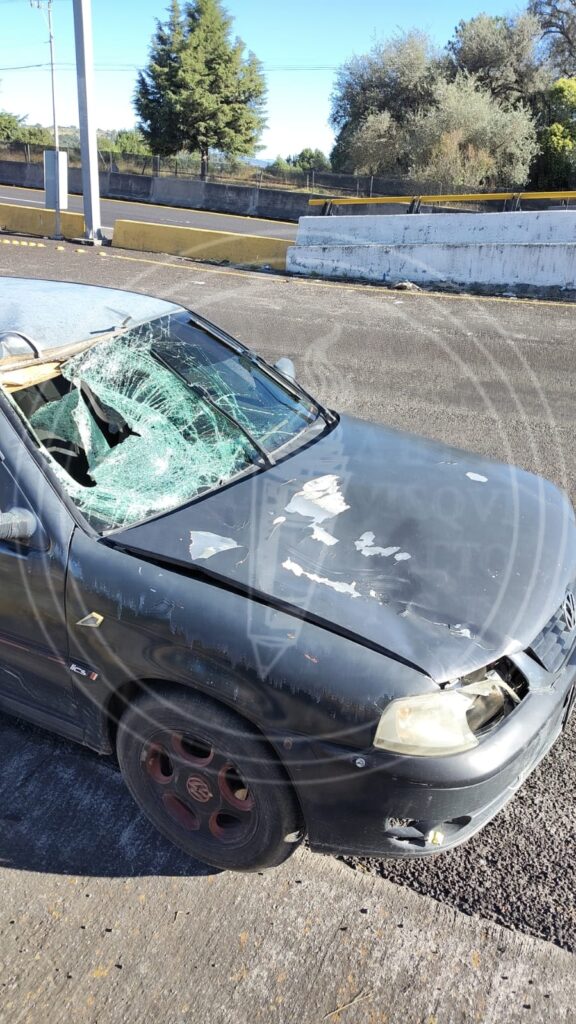 Cien metros adelante del punto donde fue encontrado el cuerpo, las autoridades localizaron un vehículo presuntamente implicado en el atropellamiento. Se trata de un automóvil *Volkswagen Pointer, color gris, con placas de Tlaxcala, que presentaba huellas visibles de accidente.