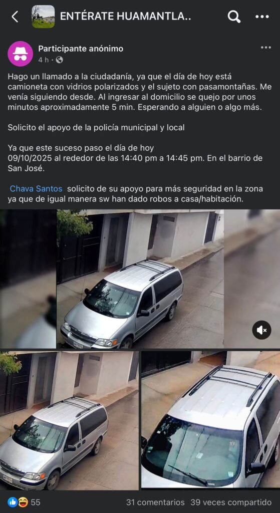 El H. Ayuntamiento de Huamantla, a través de la Dirección de Seguridad Pública, Tránsito y Protección Civil, informa que este jueves 9 de octubre se atendió de manera oportuna un reporte ciudadano en el Barrio de San José, donde se señalaba la presencia de una camioneta en actitud sospechosa.