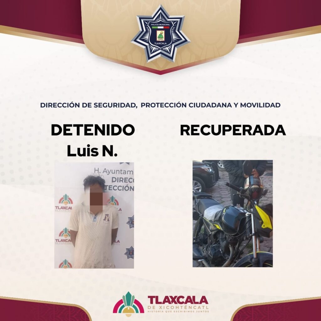La tarde del miércoles, un ciudadano reportó al sistema de emergencias el robo de su motocicleta Italika FT150 color negro con amarillo, que había dejado estacionada en la calle Diego Muñoz Camargo, colonia Centro. De inmediato, los efectivos policiales iniciaron el rastreo a través del C2 y mediante las cámaras de videovigilancia se ubicó al vehículo sobre la explanada del mercado y posteriormente cerca de la ex astabandera.