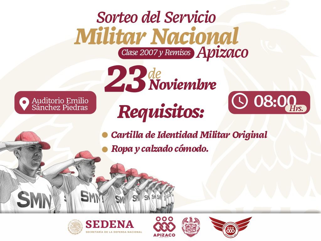 En cumplimiento a las disposiciones de la Secretaría de la Defensa Nacional (Sedena), a través de la 23/a Zona Militar, el Gobierno Municipal de Apizaco convoca a los jóvenes de la clase 2007 y remisos que tramitaron su cartilla de identidad militar durante el presente año, a participar en el sorteo del Servicio Militar Nacional 2025, que se llevará a cabo el 23 de noviembre de 2025, a las 08:00 horas, en el Auditorio Emilio Sánchez Piedras.