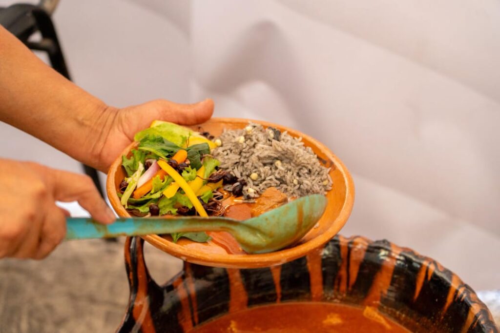 En coordinación con la Universidad del Valle de Tlaxcala (UVT), se presentó una amplia gama de moles: desde los clásicos negro, rojo y ladrillo, hasta el tradicional mole prieto, acompañados de arroz, tamales tontos y tortillas hechas a mano.