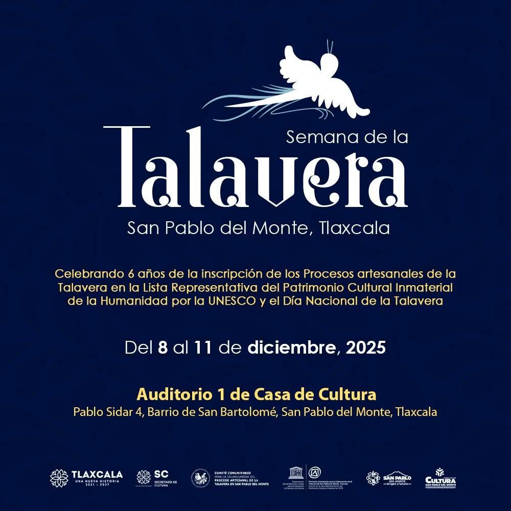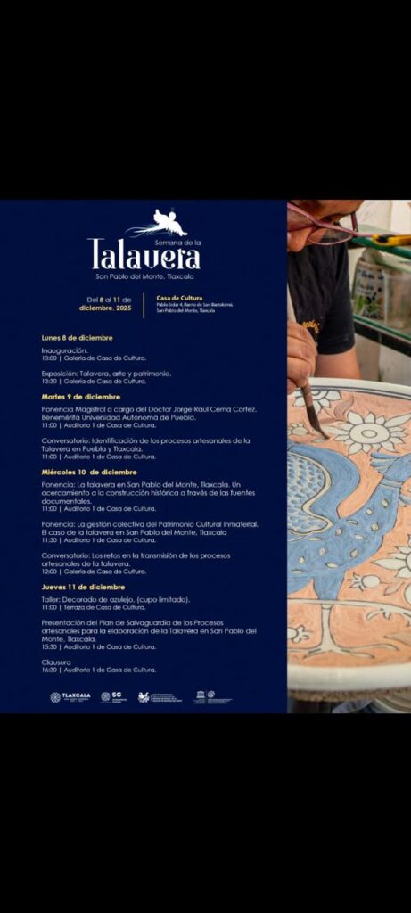 La Secretaría de Cultura de Tlaxcala invita a la ciudadanía y al público en general a participar en la Semana de la Talavera, que se llevará a cabo del 8 al 11 de diciembre en la Casa de Cultura de San Pablo del Monte.