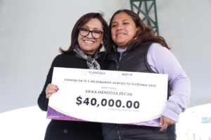 Como parte del evento, se realizó la entrega simbólica de cheques a las beneficiarias Felicitas Cuatle Nezahualcóyotl, Erika Mendoza Zecua y Maricela Gómez Moreno.