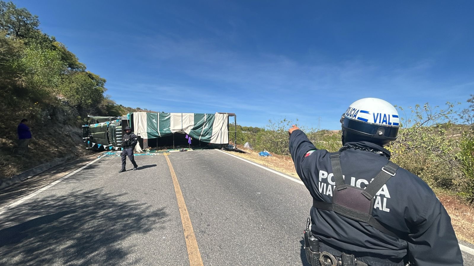 Tras recibir el reporte a través del C5i, elementos de la Policía Vial Estatal se trasladaron al punto, donde confirmaron la presencia del camión volcado y atravesado sobre la cinta asfáltica.