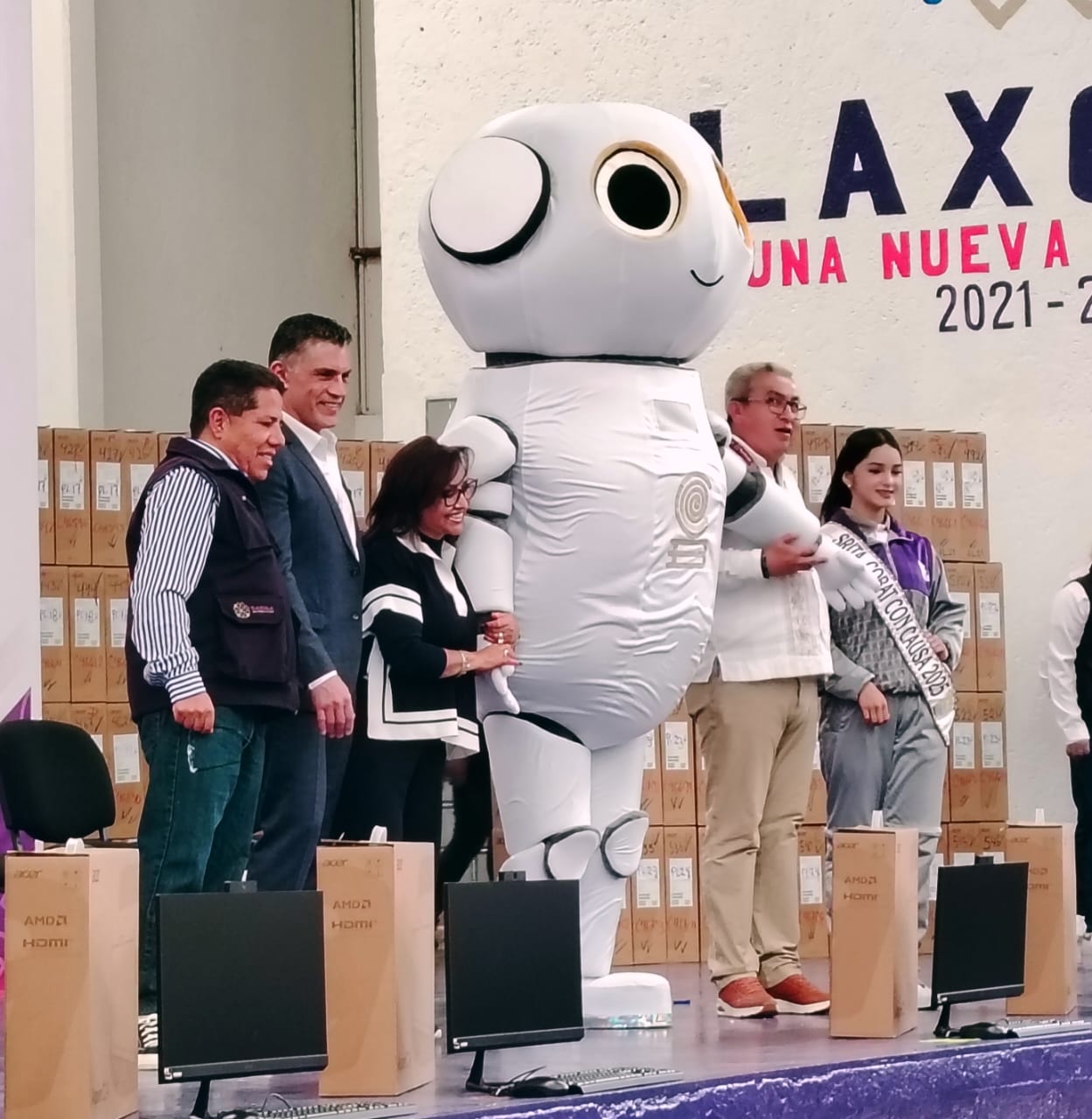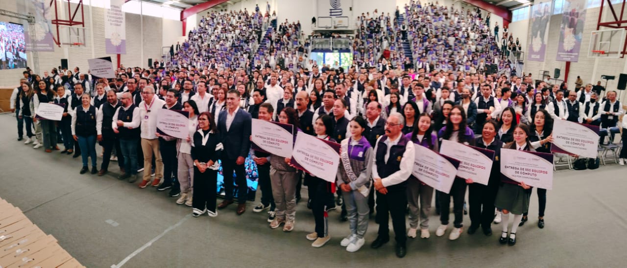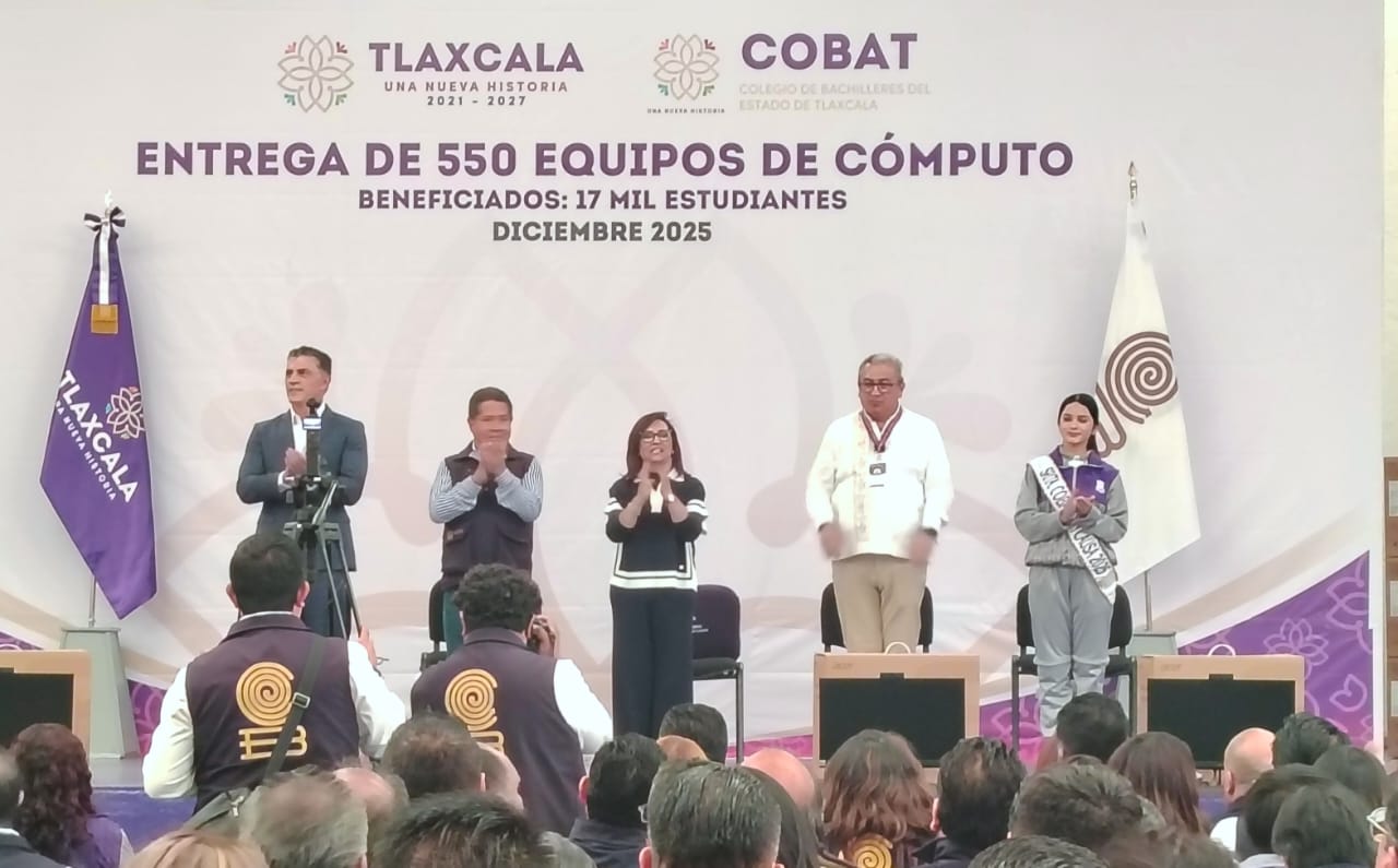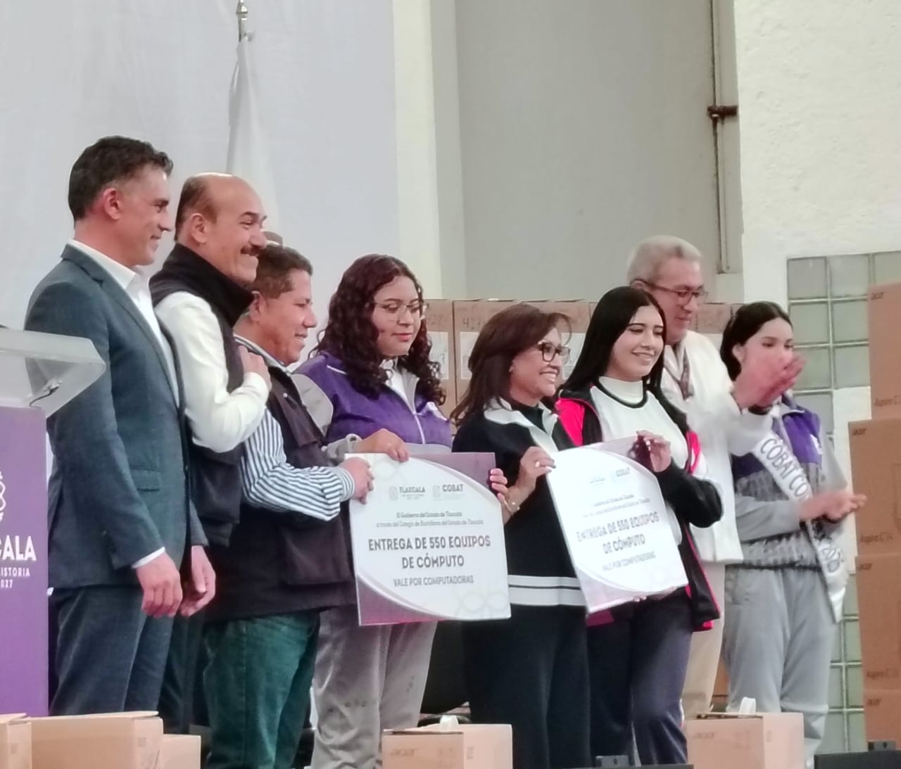 La gobernadora Lorena Cuéllar Cisneros encabezó la entrega de 550 equipos de cómputo al Colegio de Bachilleres del Estado de Tlaxcala (COBAT), como parte de un programa integral de fortalecimiento académico y tecnológico destinado a los planteles de todo el estado.