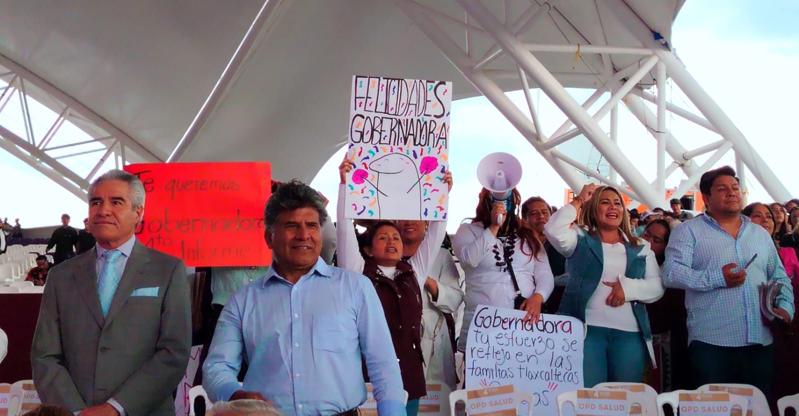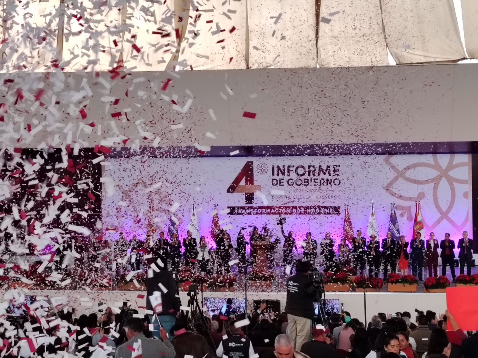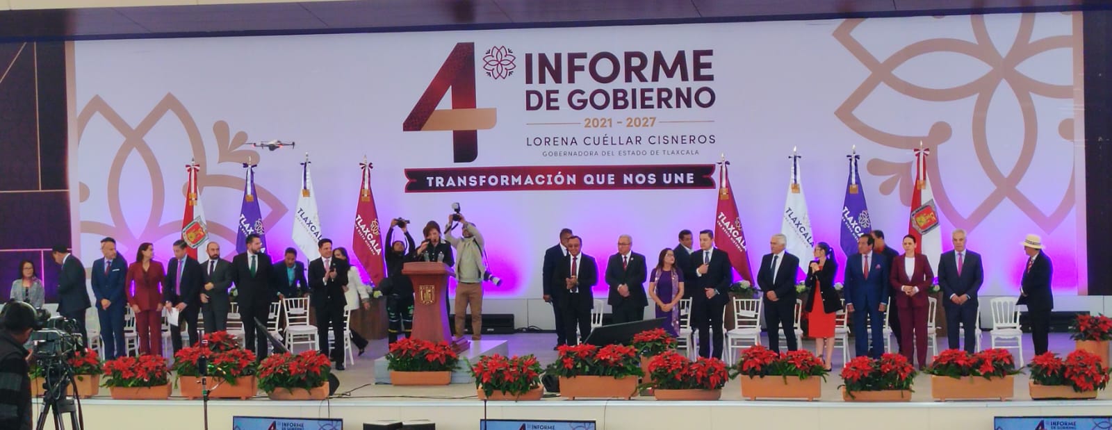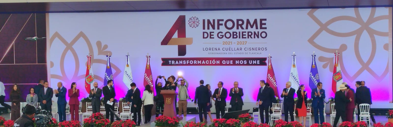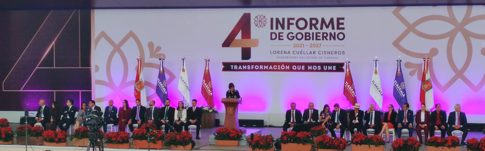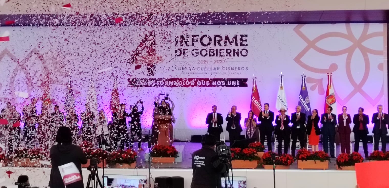 La gobernadora de Tlaxcala, Lorena Cuéllar Cisneros, presentó su Cuarto Informe de Gobierno en la Ciudad del Entretenimiento, donde asistieron integrantes del gabinete estatal, diputadas locales senadores, exgobernadores, gobernadores invitados y medios de comunicación.