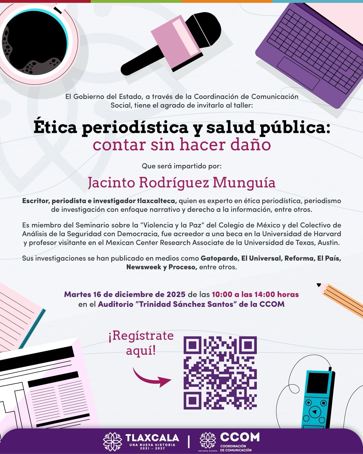 Precisó que la capacitación será impartida por el reconocido editor y reportero tlaxcalteca Jacinto Rodríguez Munguía, el próximo martes 16 de diciembre de 2025, de 10:00 a 14:00 horas, el cual brindará herramientas éticas y profesionales.