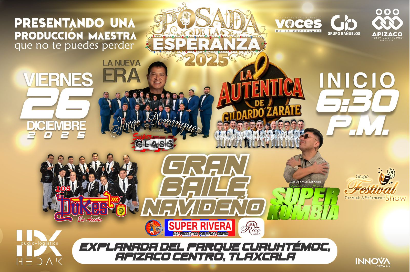 El Ayuntamiento de Apizaco, bajo el liderazgo del presidente Javier Rivera Bonilla, en colaboración la Asociación Civil Voces de la Esperanza Tlaxcala anuncian un cartel musical de cinco agrupaciones para la Posada de la Esperanza.