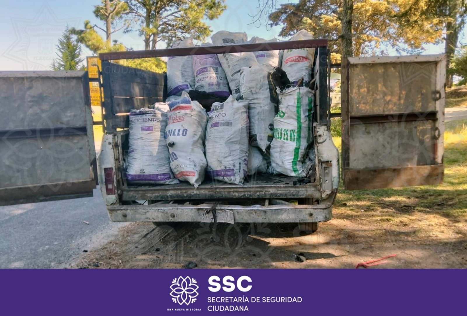 Durante el operativo, elementos de seguridad, al circular sobre la carretera perimetral y el camino 7 descendente, a la altura del municipio de Mazatecochco, localizaron una camioneta marca Chevrolet, tipo Pick Up, con placas de circulación del estado de Tlaxcala, la cual se encontraba abandonada. Al realizar la inspección correspondiente, se detectó que la unidad transportaba 29 costales de carbón vegetal.