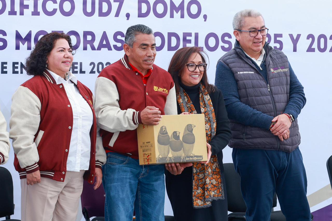 La gobernadora Lorena Cuéllar Cisneros destacó que su administración mantiene como prioridad generar más y mejores oportunidades para las juventudes tlaxcaltecas, durante el acto de entrega del edificio de Unidad de Docencia siete (UD7), un domo, equipamiento especializado y cuatro unidades motoras modelos 2025 y 2026 en la Universidad Politécnica de Tlaxcala (UPTX).