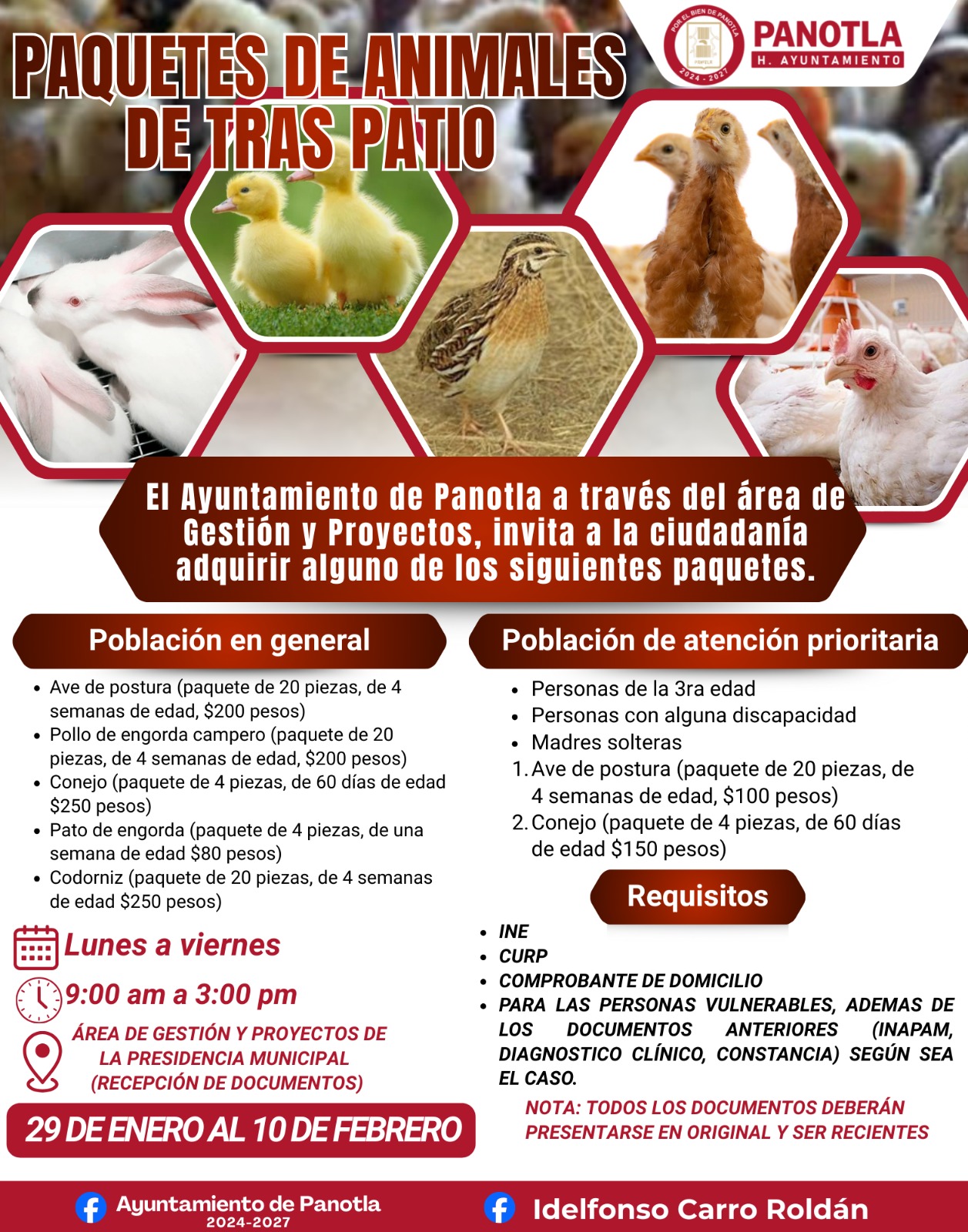 Este programa está dirigido tanto a la población en general como a grupos de atención prioritaria, ofreciendo paquetes a bajo costo de aves y animales de granja, con el objetivo de brindar oportunidades productivas y mejorar las condiciones de vida de las familias panotlenses.