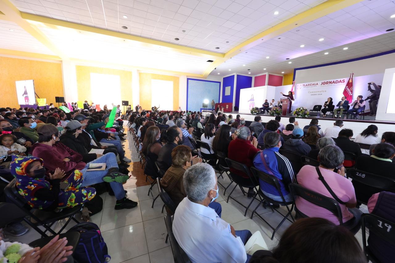 •En la Jornada “Cumpliendo al Pueblo”, en Cuaxomulco, la gobernadora Lorena Cuéllar Cisneros destacó que Tlaxcala avanza hacia un modelo de desarrollo integral, con mayor seguridad, inclusión social, crecimiento económico y bienestar para la población