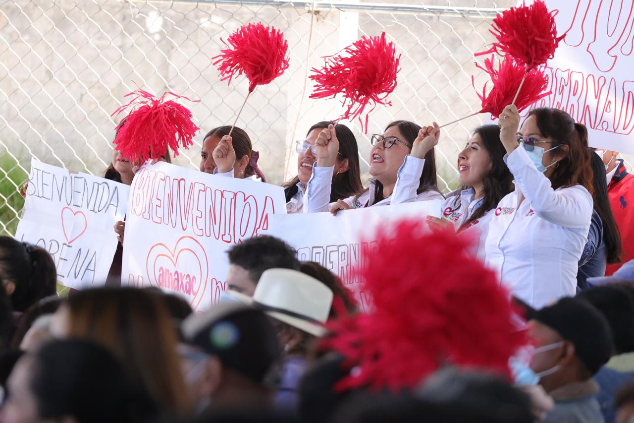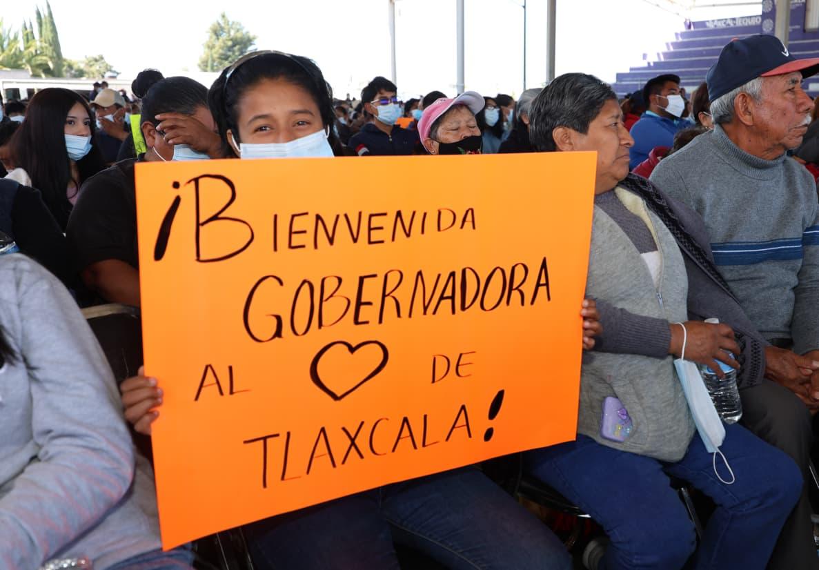 La mandataria estatal agradeció el recibimiento de la ciudadanía, que reconoció con aplausos, porras y cartulinas de apoyo, los avances que registra Tlaxcala, como resultado de las acciones realizadas por la presente administración.