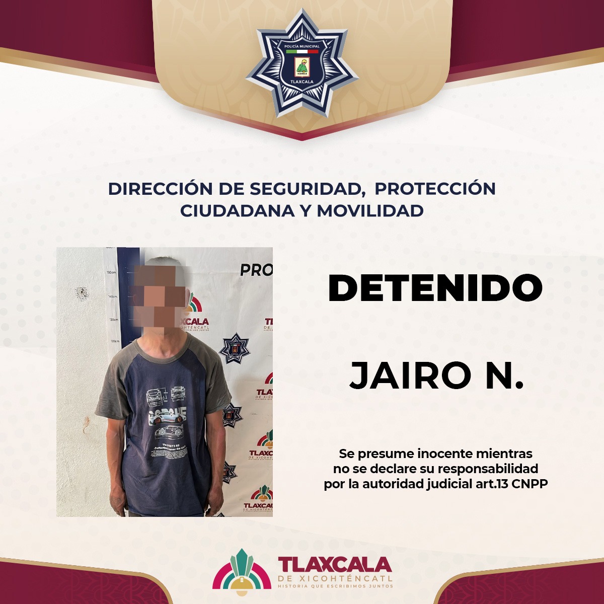 Posteriormente, el detenido fue puesto a disposición de la Fiscalía General de Justicia del Estado de Tlaxcala, instancia que determinará su situación jurídica conforme a derecho.