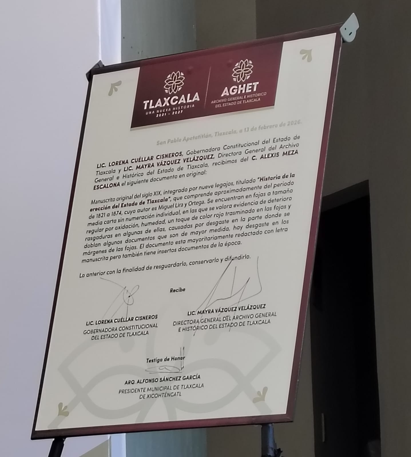 Por su parte, el presidente municipal de Tlaxcala, Alfonso Sánchez García, señaló que el manuscrito constituye un testimonio directo de la vida política y social del siglo XIX, al contener documentos originales escritos por una de las figuras que participó en la transformación de Tlaxcala de territorio a estado. Añadió que la preservación de este material representa un esfuerzo conjunto para rescatar y resguardar documentos históricos que permiten comprender el desarrollo institucional de la entidad.