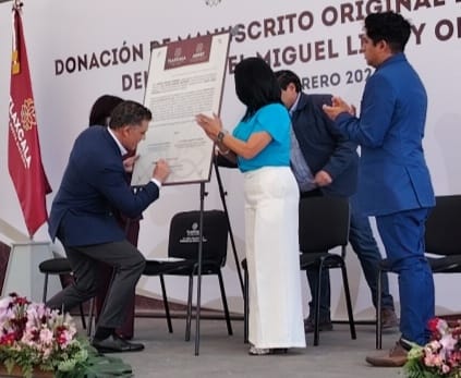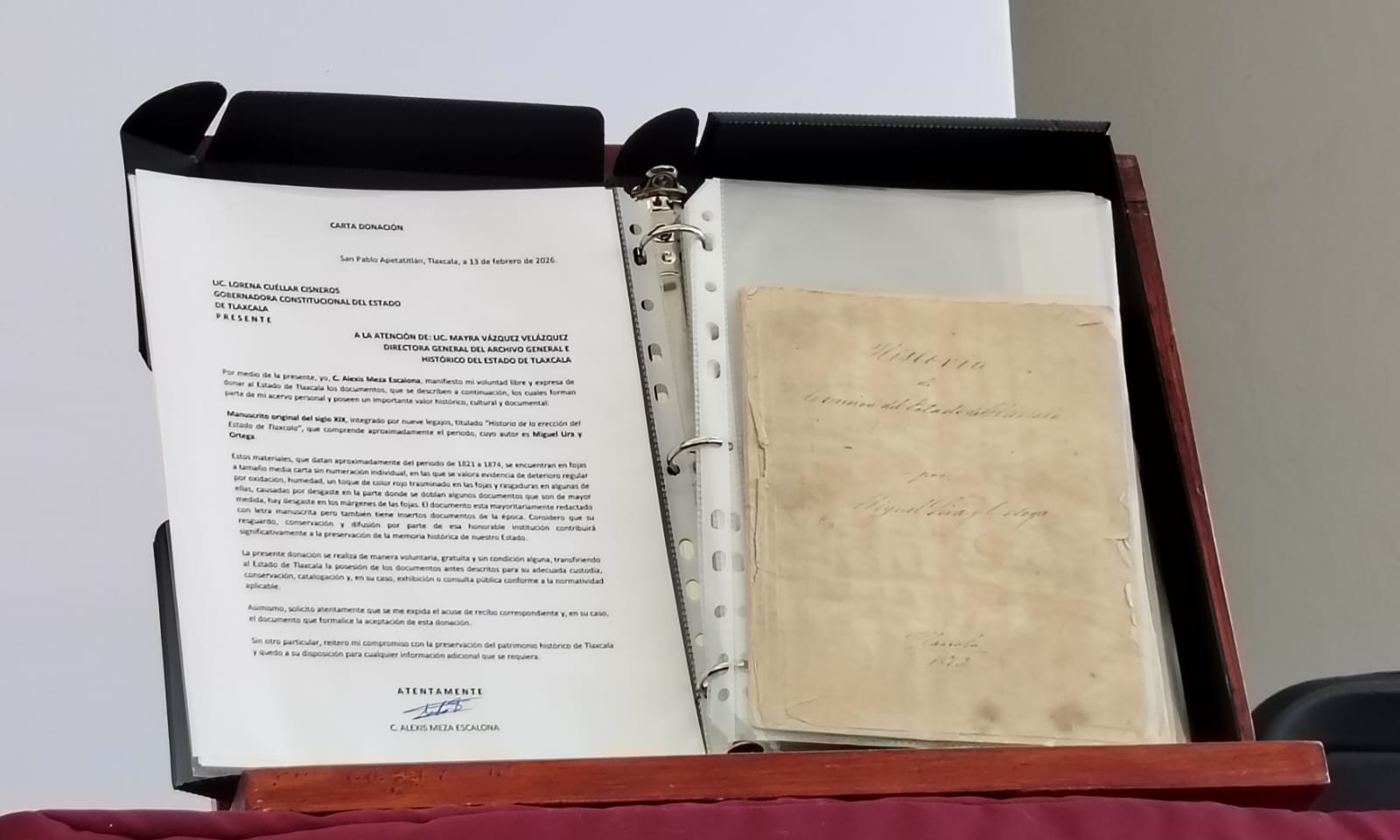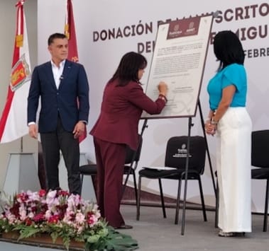 La gobernadora de Tlaxcala, Lorena Cuéllar Cisneros, encabezó la donación de un manuscrito original del siglo XIX del coronel Miguel Lira y Ortega, documento que será resguardado en el Archivo Histórico del estado como parte de las acciones para preservar la memoria histórica de la entidad.