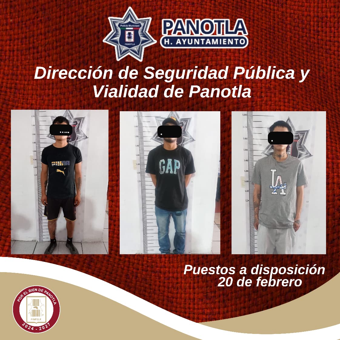 La Dirección de Seguridad Pública y Vialidad del Municipio de Panotla informa que, derivado de los patrullajes de rutina implementados con el objetivo de prevenir e inhibir conductas delictivas, se logró la detención de tres personas del sexo masculino que se encontraban consumiendo narcóticos en la vía pública.