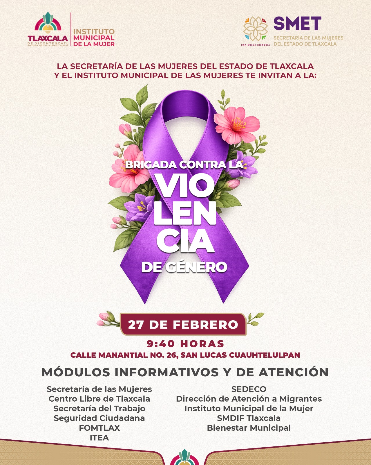 En una acción coordinada para garantizar el bienestar y los derechos de las mujeres tlaxcaltecas, el Ayuntamiento de la capital, que preside Alfonso Sánchez García, en coordinación con la Secretaría de las Mujeres del Estado de Tlaxcala, llevará a cabo la Brigada contra la Violencia de Género en la comunidad de San Lucas Cuauhtelulpan.