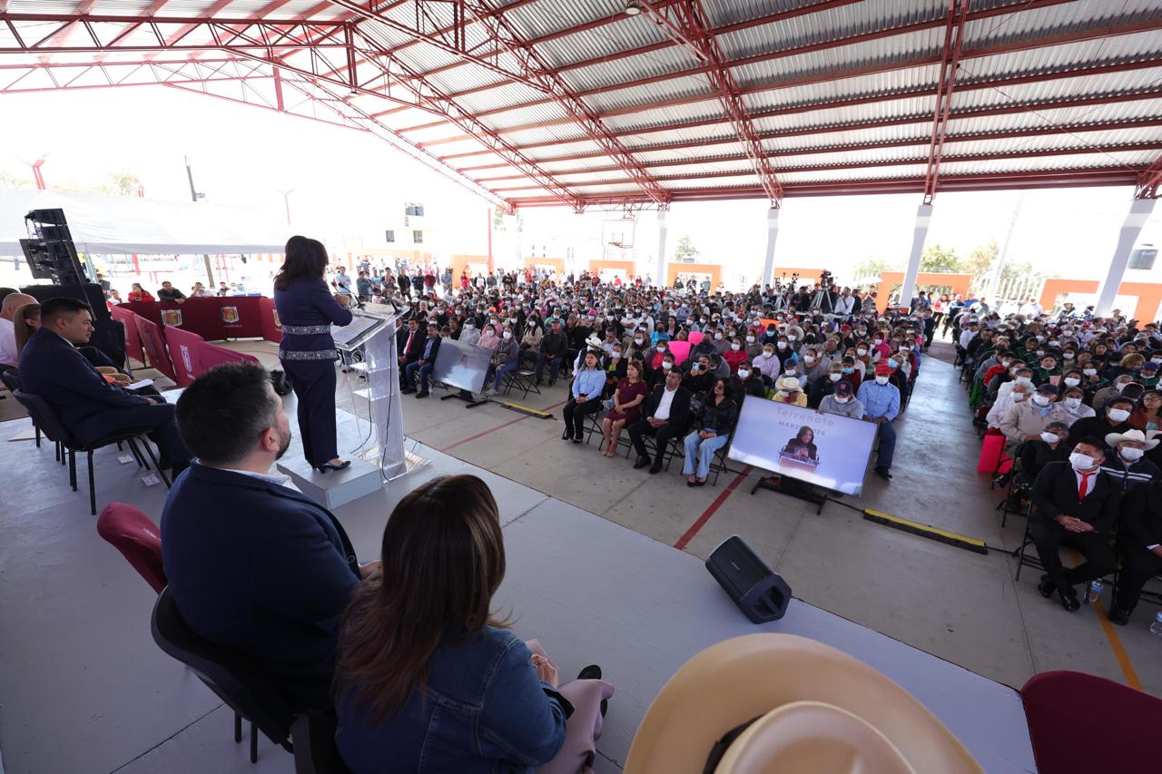 La gobernadora Lorena Cuéllar Cisneros informó que, con una inversión superior a los 76.4 millones de pesos en obra pública, su administración fortalece el desarrollo y transforma la vida de las familias de Terrenate, durante el Encuentro Tlaxcalteca que se llevó a cabo en el municipio.