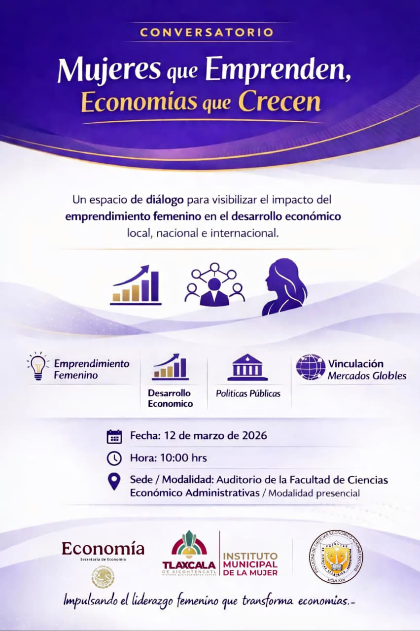Con el objetivo de visibilizar el impacto del emprendimiento femenino en el desarrollo económico local, nacional e internacional, el Instituto Municipal de la Mujer (IMM), en colaboración con la Secretaría de Economía y la Facultad de Ciencias Económico Administrativas de la Universidad Autónoma de Tlaxcala (UATx), llevará a cabo el conversatorio “Mujeres que Emprenden, Economías que Crecen”.
